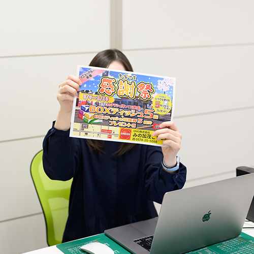 「最近ですと、昨年11月にオープンした『みの加茂こび店』の掲示物もこちらで担当しました。ポスターや価格表、新聞の折込チラシなどのデザインを通して、新店舗の魅力を伝えていくのですが、スタッフやお客様に褒めていただけると嬉しいですね。」